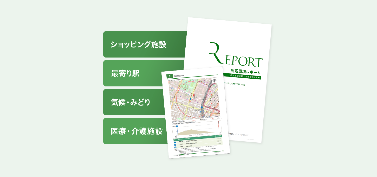 お客様に、人口やご近所の情報、ハザード情報、学区や商業施設など住まい選びの参考になる情報をのレポートが作成できます。